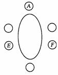 (8分)一张椭圆形桌旁有六个座位,A、E、F先坐在如图所示的座位上,B、C、D三人随机坐到其他三个座位,求A与B不相邻而座的概率。