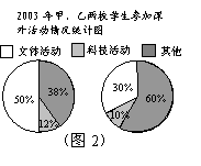 17. (9分) 下面两幅统计图(如图1、图2),反映了某市甲、乙两所中学学生参加课外活动的情况.请你通过图中信息回答下面的问题.
