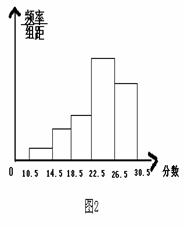 50名学生进行了立定跳远、铅球、100米三个项目的测试,每个项目的满分为10分.如图2,是将该班学生所得的三项成绩(成绩均为整数)进行整理后,分成5组画出的频率分布直方图,已知从左至右前4个小组的频率分别为0.02,0.1,0.12, 0.46.下列说法:①学生的成绩≥27分的共有15人;②学生的成绩的众数在第四小组(22.5-26.5)内;③学生的成绩的中位数在第四小组(22.5-26.5)内.其中正确的说法是
