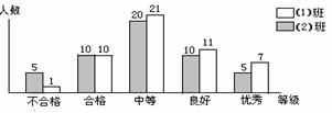 18. 下图反映了某校初二(1)、(2)两班各50名学生电脑操作水平等级测试的成绩,其中不合格、合格、中等、良好、优秀五个等级依次转化为50分、60分、70分、80分、90分,试结合图形计算: ①(1)班学生成绩众数是 分、中位数是 分; ②(2)班学生成绩的平均数是 分、方差是 .