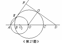 27、(本题10分)如图,已知:AO为⊙O1的直径,⊙O1与⊙O的一个交点为E,直线AO交⊙O于B、C两点,⊙O的切线GF交直线AO于点D,与AE的延长线垂直相交于点F.