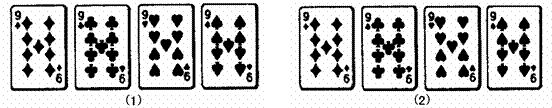 7、4张扑克牌如图(1)所示放在桌子上,小敏把其中一张旋转180º后得到如图(2)所示,那么她所旋转的牌从左数起是 ( )