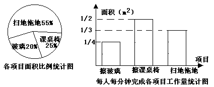 某班13位同学参加每周一次的卫生大扫除,按学校的卫生要求需要完成总面积为80m2的三个项目的任务,三个项目的面积比例和每人每分钟完成各项目的工作量如下图所示: