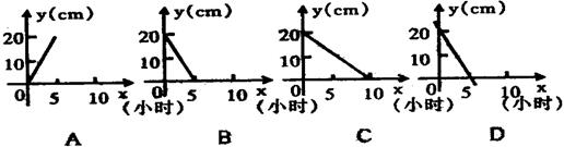 一根蜡烛长20cm,点燃后每小时燃烧4cm,燃烧过程中蜡烛的高度y(cm)与燃烧时间x(小时)的函数关系,用图象表示为( )