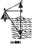 (本题6分)如图,湖边有一座小山,现在小山的顶部A测得湖中一个小岛上的一棵树的树梢C的仰角为30°,同时测得树梢在湖水中的像D的俯角为60°。若山顶A到该树的水平距离AE为20米,求山高AB为多少?(观察时湖水是平静的,且计算结果保留根号)