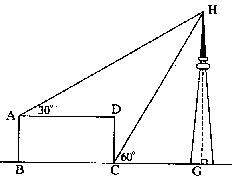 16、 如图所示,形状为长方形的建筑物ABCD的底端BC的长是70米,高AB=30米,从A、C两点可测得河对面一电视发射塔的顶端H的仰角分别为30°和60°,求塔的高度HG(精确到1米,