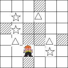 (△代表木箱,☆代表木箱应到的目的地,□代表空地, 代表墙壁,移动一次只动一个格)其中第一关是如图一设计。移动方案为: