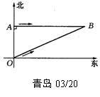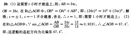 (青岛03/20)(6分)人民海关缉私巡逻艇在东海海域执行巡逻任务时,发现在其所处位置O点的正北方向10海里处的A点有一涉嫌走私船只,正以24海里/小时的速度向正东方向航行.为迅速实施检查,巡逻艇调整好航向,以26海里/小时的速度追赶,在涉嫌船只不改变航向和航速的前提下,问⑴需要几小时才能追上?(点B为追上时的位置)⑵确定巡逻艇的追赶方向(精确到0.1°).