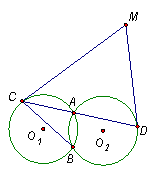 (17) 如图,已知两个等圆⊙O1与⊙O2相交于A、B两点,一条直线经过点A,分别与两圆相交于点C、D,MC切⊙O1于点C,MD切⊙O2于点D,若∠BCD=30°,则∠M等于________(度)