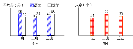 21、最近,金苹果中学九年级三个班级进行了一次统一测验,图六是各班的语文和数学考试平均分情况表,图七是三个班级学生人数统计表.