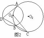 25、已知⊙O1与⊙O2相交于A、B两点,且O2在⊙O1上。⑴如图一,AD是⊙O2的直径,连结DB并延长交⊙O1于点C,求证:C O2⊥AD;⑵如图二,AD是⊙O2的一条弦,连结DB并延长交⊙O1于点C,这时C O2所在直线是否仍与AD垂直?请证明你的结论。(11分)