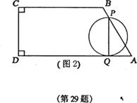 29.如图l,在直角梯形ABCD中,∠D=∠C=900,AB=4,BC=6,AD=8.点P、Q同时从A点出发,分别作匀速运动,其中点P沿AB、BC向终点C运动,速度为每秒2个单位,点Q沿AD向终点D运动,速度为每秒1个单位.当这两点中有一个点到达自己的终点时,另一个点也停止运动,设这两点从出发运动了t秒.