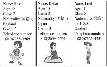 Look at(看) Li Ming. He is from Guangzhou. He is thirteen years old. Now he is in Guangzhou Yuying Junior High School. He is in Class Five, Grade Eight. His phone number is (020)7868-9688.