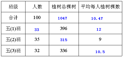 答案不唯一: 第一条:五(1)班植树的总棵数最多. 第二条:五(1)班平均每人植树的棵数最多. 第三条:五(2)班植树的总棵数最少. 第四条:五(2)班平均每人植树的棵数最少. |