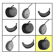 三种水果的摆放规律是:每一行或每一列都分别摆放着三种水果。