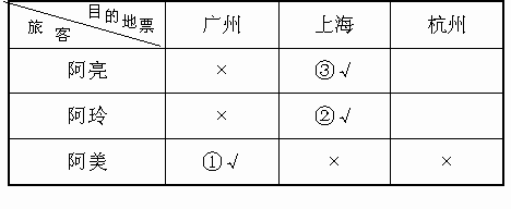 首先由阿美既不要杭州的票,也不要上海的票,所以她要广州的票。剩下的两张,一张是上海的,一张是杭州的,由阿玲不要上海的票,可知她要杭州的票,剩下一张是阿亮的。其实这类题也可列表解答 (见表)