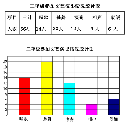 丽丽对二年级同学参加文艺演出的情况进行了调查,记录在表中.请你整理后填入统计表中,并制成统计图.