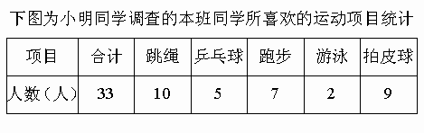 | 项目 | 合计 | 跳绳 | 乒乓球 | 跑步 | 游泳 | 拍皮球 | 其它 |