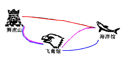 明光小学二(1)班的同学们在动物园游玩,他们要从狮虎山到达海洋馆,他们可以怎样走?(用不同颜色的笔画一画)一共有多少种不同的走法?