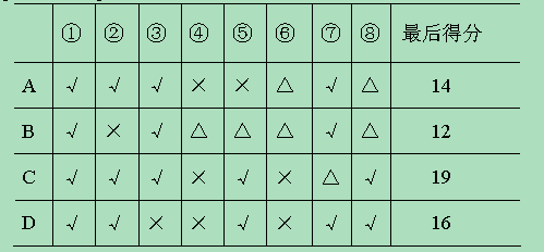(3)班同学一次科普知识小竞赛的比赛记录,比赛规定答对一题得5分,答错一题扣3分,不答不扣.用“√”表示答对,“×”表示答错,“△”表示没答,计算他们的最后成绩,并排出名次.![]()