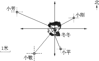 小芳在冬冬的________偏________ ________的方向上,距离是________米.冬冬在小芳的________偏________ ________的方向上,距离是________米.(2)