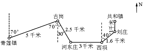 ( )( )°的方向行( )千米到古岗,再向( )偏( )( )°方向行( )千米到河东庄,接着向( )行( )千米到西坝.由西坝向( )偏( )( )°方向行( )千米到刘庄,最后向( )行1千米到共和镇.查看答案和解析>>