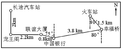 ( )偏( )( )°方向行( )千米到幸福桥,再向( )偏( )( )°方向行( )千米到中国银行,接着向( )偏( )( )°方向行0.8千米到联谊大厦,然后向( )行( )千米到龙王阁,最后向( )行2千米到达长途汽车站.查看答案和解析>>