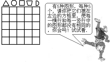 6个面包、6瓶矿泉水、6块巧克力、6只咸鸭蛋、6袋榨菜、6根火腿肠,请你把他们放在右边的方盒里,使每一横行,每一竖行都有6种食品,你会放吗?![]()