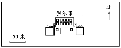 丽丽家在俱乐部的北偏西15°方向上,距离50米(用□表示丽丽家).![]()
