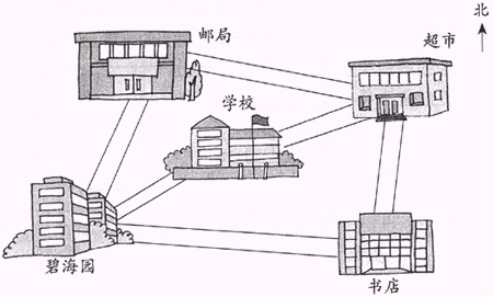 说一说,小军家四周分别是什么单位?