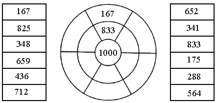 把下面左、右格子里的数填入中间圆的空格里,使它们的和是