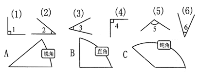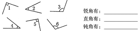 请你用红色的“⌒”标出锐角、蓝色的“┑”标出直角、绿色的“⌒”标出钝角.